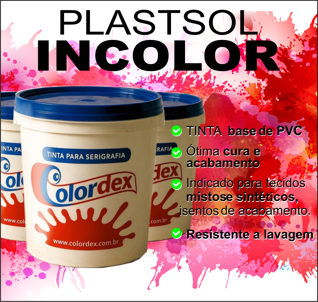 Plastcolor Incolor é uma tinta a base de Polímeros de PVC, Plastificantes Nobres e Dióxido de Titânio, isento de solventes voláteis, chegando a sua formulação a aproximadamente 99,6% de sólidos. Cuidadosamente desenvolvida para trabalhos em impressão serigráfica (Silkscreen), onde o principal objetivo é a sua cobertura com cores vivas ao motivo aplicado.